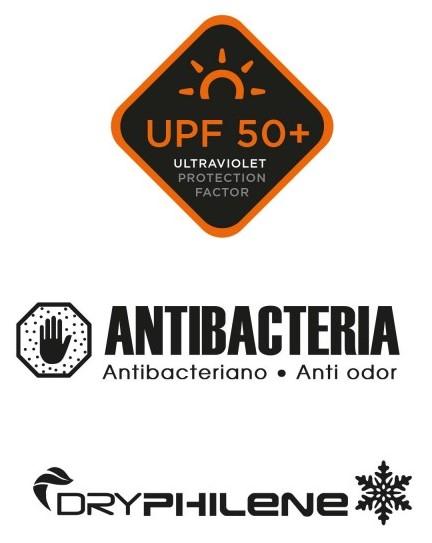 - UPF 50: Protección extra contra los rayos UV. a los que estamos expuestos durante todo tipo de actividades, incluso en los días nublados. Protección solar permanente, no se elimina con los lavados. - Dry Philene: El hilado de Dry Philene, es un compuesto por tres diferentes fibras sinteticas que impiden que absorba el agua. Actúa como un conducto de la humedad y el sudor exteriorde la prenda, acelerando el proceso de evaporación. Esta característica del hilado lo hace 100% antibacteriano. Además este hilado tiene la propiedad de termoregulacion lo que proporciona calor en climas frios y te mantiene fresco en climas de calor.