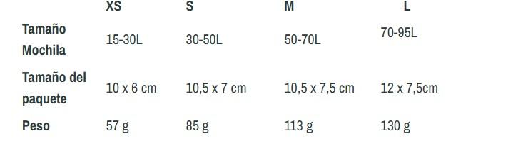 • Tallas: Se vende en cuatro tamaños para adaptarse a mochilas de día y mochilas grandes.