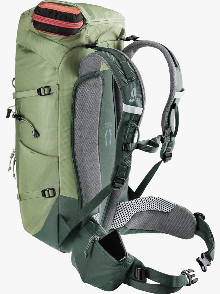 El sistema de espalda Airstripes de Deuter garantiza una posición estable con buena ventilación, permitiendo una óptima circulación del aire con un contacto mínimo con la espalda. El peso siempre permanece cerca del cuerpo, sin fuerzas centrífugas que puedan provocar el desprendimiento de la mochila.