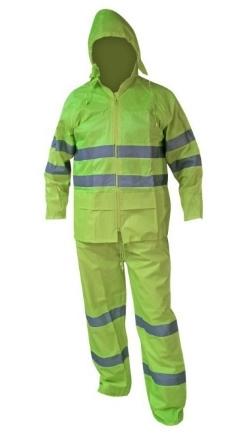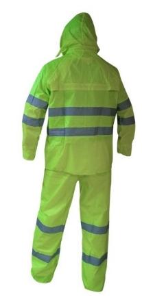2 piezas: pantalón y chaqueta. Para dar mayor comodidad y flexibilidad a los movimientos. Material: Nylon impermeable y no conductivo, de alta visibilidad para labores viales. Cintas reflectantes de 2” (Norma MOP). Ventilación en la espalda y bajo los brazos para evacuar el exceso de calor generado por el cuerpo. Cierre frontal de alto desempeño con cubierta para mayor impermeabilización. Mangas elasticadas para evitar el ingreso del viento y el agua. Cintura del pantalón elasticada.